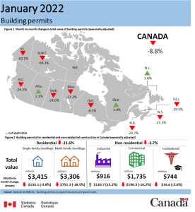 Statistics Canada reports that steep declines in commercial and multi-family residential projects were major contributors to a decrease of almost nine per cent in the seasonally adjusted value of building permits in January, which landed at $10.1 billion in the first month of 2022.