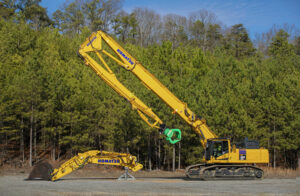 It uses Komatsu’s in-house boom change system that includes oversized quick connectors for the hydraulic lines that minimize back pressure and oil heating without restricting oil flow. The system also features hydraulically powered pins mounted inside the main boom structure to help reduce the risk of damage to the equipment during reconfiguration.
